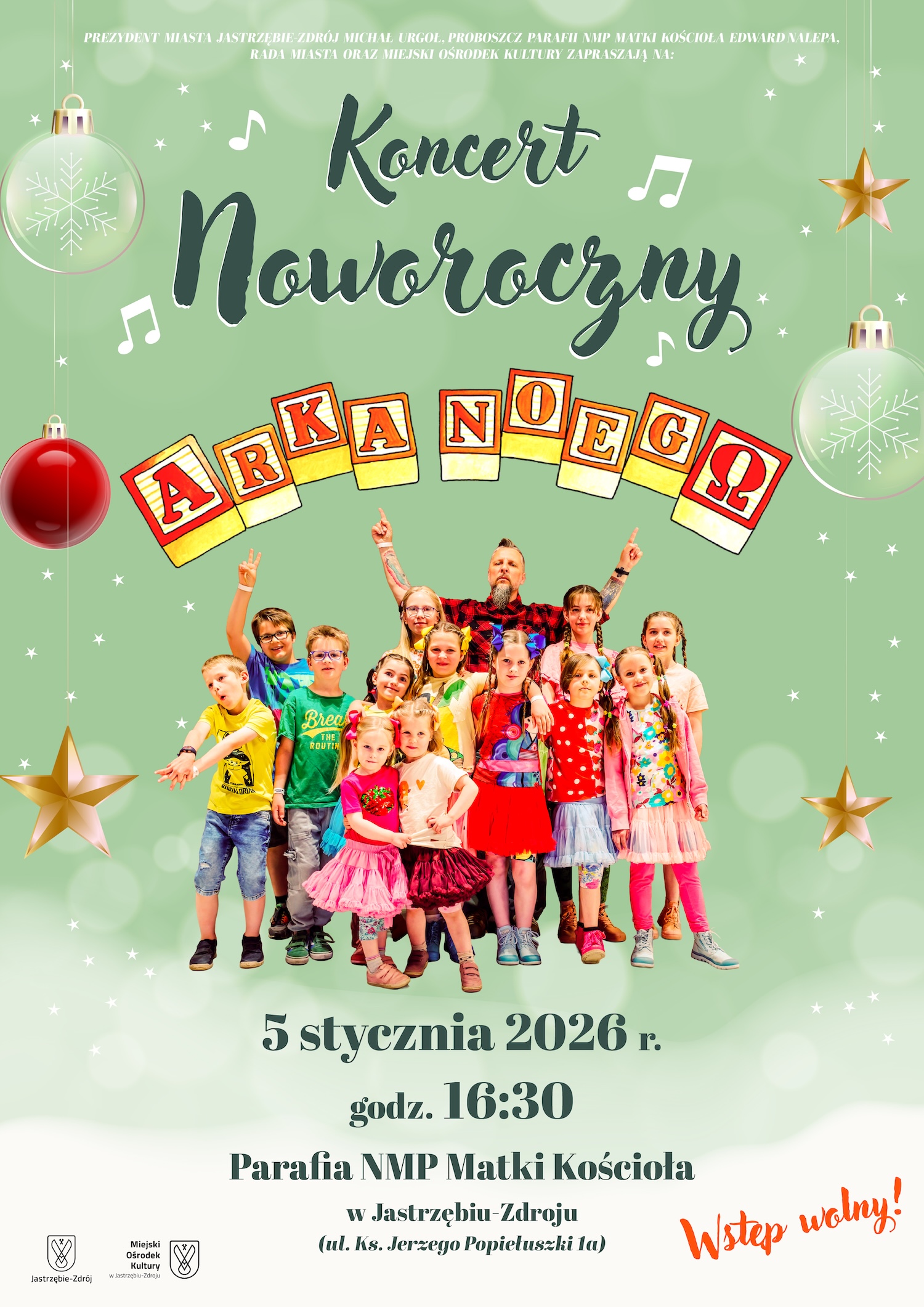 Prezydent Miasta Jastrzębie-Zdrój Michał Urgoł, Rada Miasta, proboszcz Parafii NMP Matki Kościoła ks. Edward Nalepa oraz Miejski Ośrodek Kultury w Jastrzębiu-Zdroju serdecznie zapraszają na wyjątkowy Koncert Noworoczny .