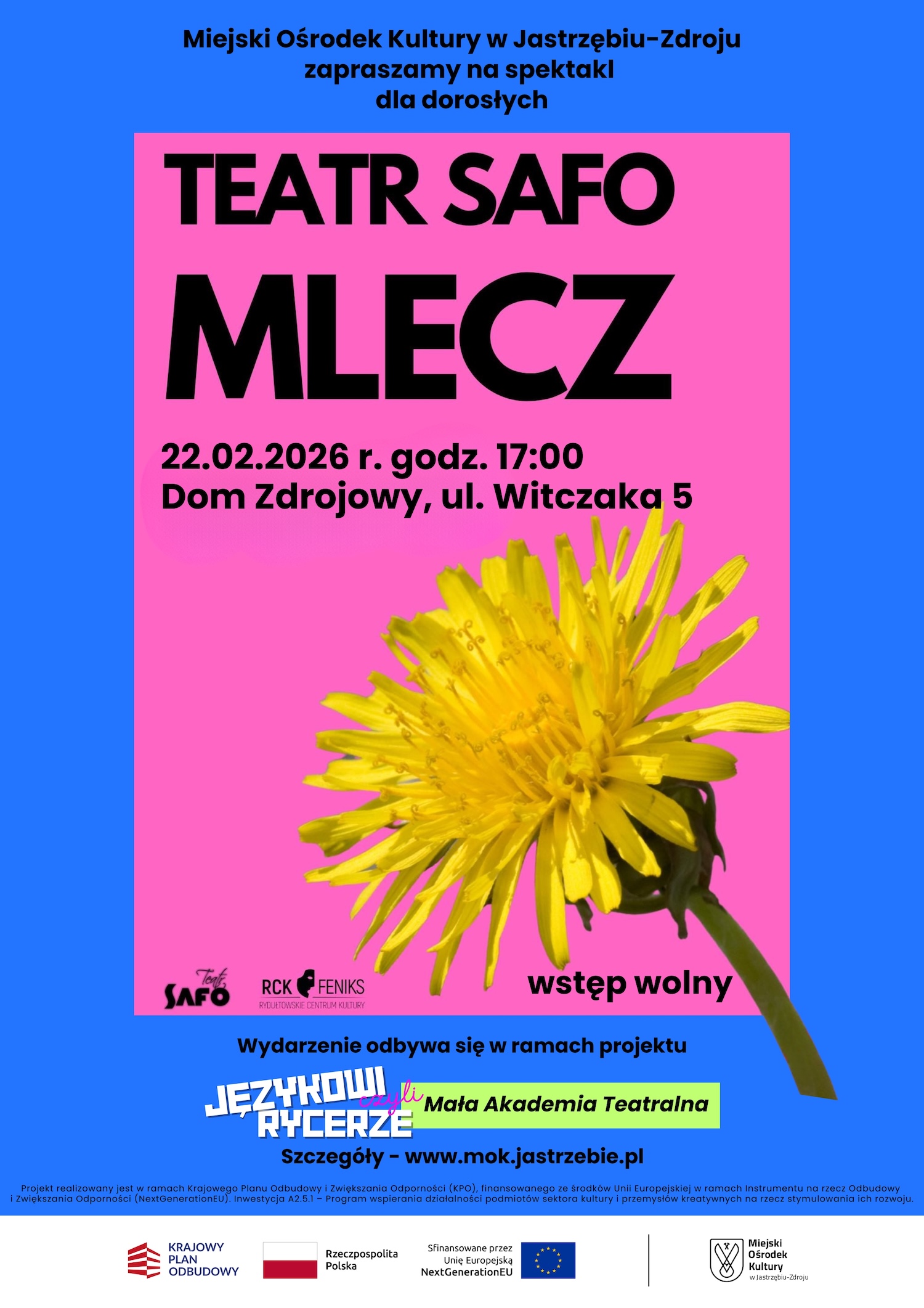 Psychologia mówi o dzieciach-orchideach, delikatnych i wrażliwych, które potrzebują troski, by przetrwać. Są też dzieci-mlecze czyli takie, które wyrastają nawet w najtrudniejszych warunkach, silne, choć często traktowane jak „chwasty”. Z czasem stają się dmuchawcami i albo niosą ze sobą traumę na kolejne pokolenia, albo rozpraszają swoją historię w świat, żeby dawała otuchę, nadzieję i coś twórczego. Teatr SAFO w swoim nowym dziele porusza między innymi kwestię DDA - Dorosłego Dziecka Alkoholika - trudnego dzieciństwa i jeszcze trudniejszej dorosłości.